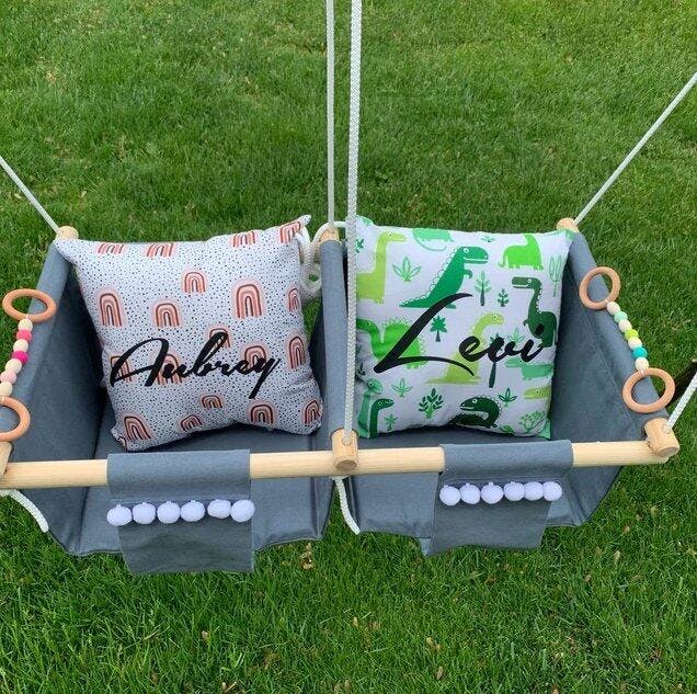 Domājot par jūsu mieru un bērna drošību, šīs bērnu šūpoles ir izgatavotas no dubultā kokvilnas auduma un personalizēta spilvena. Mīkstais spilvens padara tās skaistākas, ērtākas un jaukas. Ja vēlaties šīs šūpoles padarīt vēl īpašākas, varam tās personalizēt!