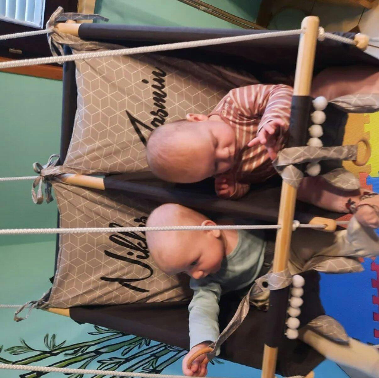 Dvīņu šūpulis vienmēr ir lieliska ideja bērniem ar nelielu vecuma starpību vai dvīņiem. Abi bērni būs apmierināti. Nevienam nav jāgaida sava kārta, un smiekli ir garantēti. Turklāt šūpulis augs kopā ar jūsu mazuli, jo tas ir piemērots no 3 mēnešu vecuma līdz pat 20 kg. Jūs varat viegli mainīt šūpošanās pozīciju guļus, pussēdus vai pilnībā sēdus, ar aizmugurējo virvju palīdzību - jo garākas tās ir, jo šūpulis būs vairak sēdus režīmā, un otrādāk. Vai tas nav lieliski?