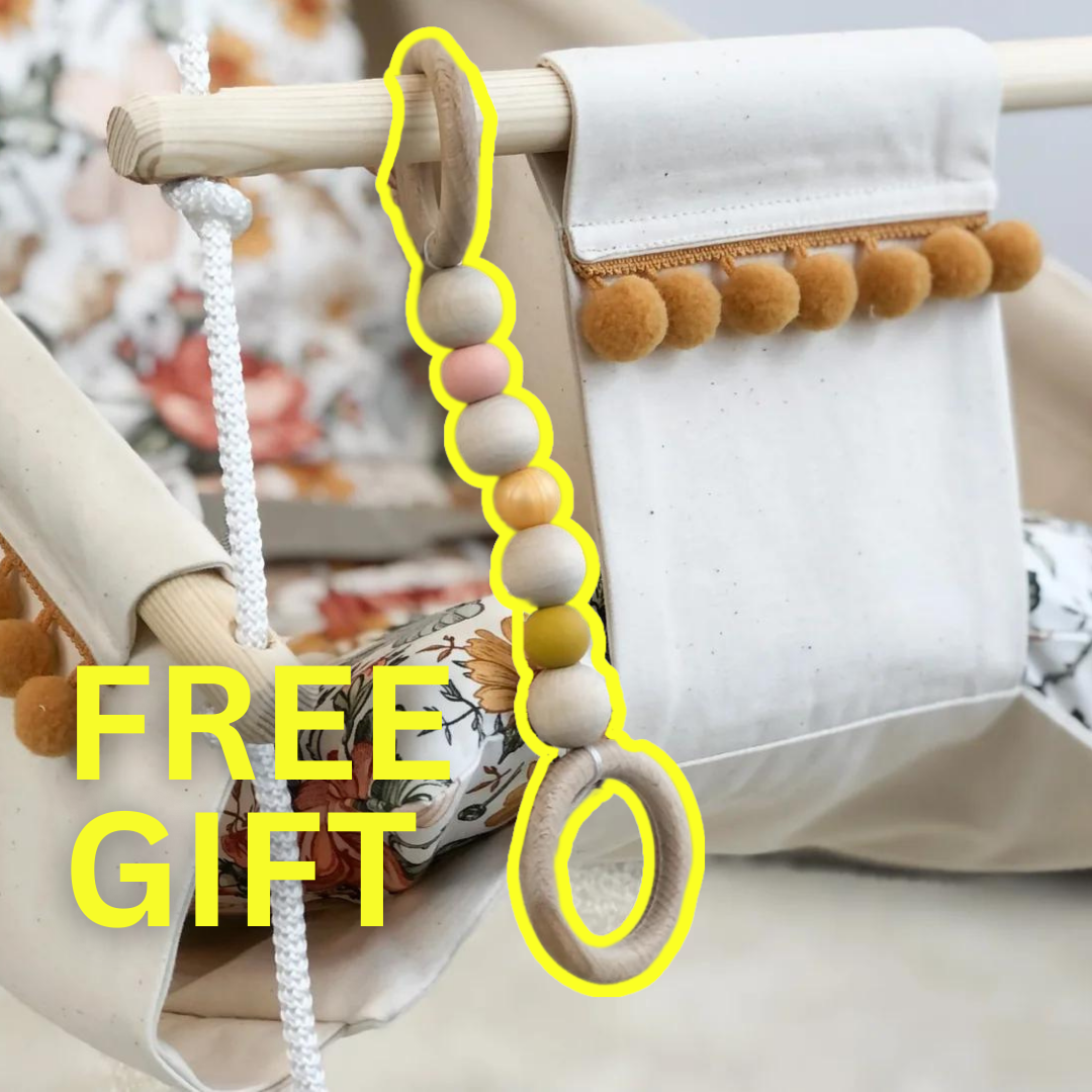 Katrām šūpolēm esam izveidojuši koka zobu gredzenu. Pilnīgi dabiska, ar rokām radīta maņu rotaļlieta jaundzimušajam!